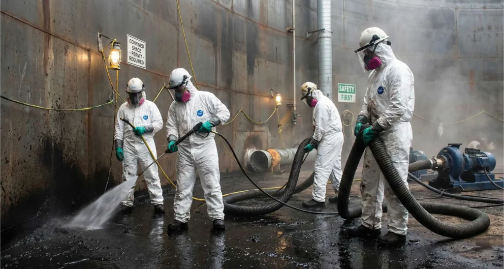 Internal tank cleaning using controlled methods to minimize downtime and ensure operational safety.